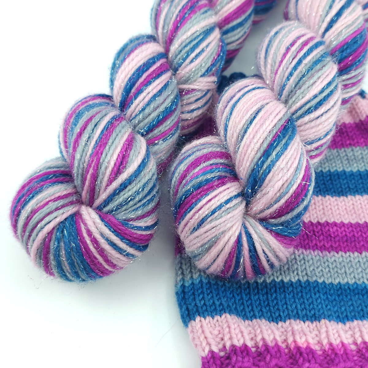 Matchy Matchy sets are pairs of 50g skeins that are dyed in a such a manner that the stripes match exactly. This makes having perfectly matched sock a breeze. They are ideal for those knitting wizards that can knit their socks 2 at a time.